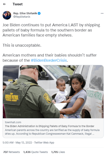 佛罗里达州的共和党议员卡特-卡马克(Kat Cammack)发表照片,将海关和边境保护局(CBP)的一个处理点的所谓奶粉库存与一个半空的商店货架并列。但目前没有迹象表明全国婴儿配方奶粉的短缺与向美国边境羁押的移民婴儿分发配方奶粉有关,虽然卡马克议员在推文中写道”This is what America Last Look Like”, 但她却随后在一则声明中澄清她并不是要提出这一主张。