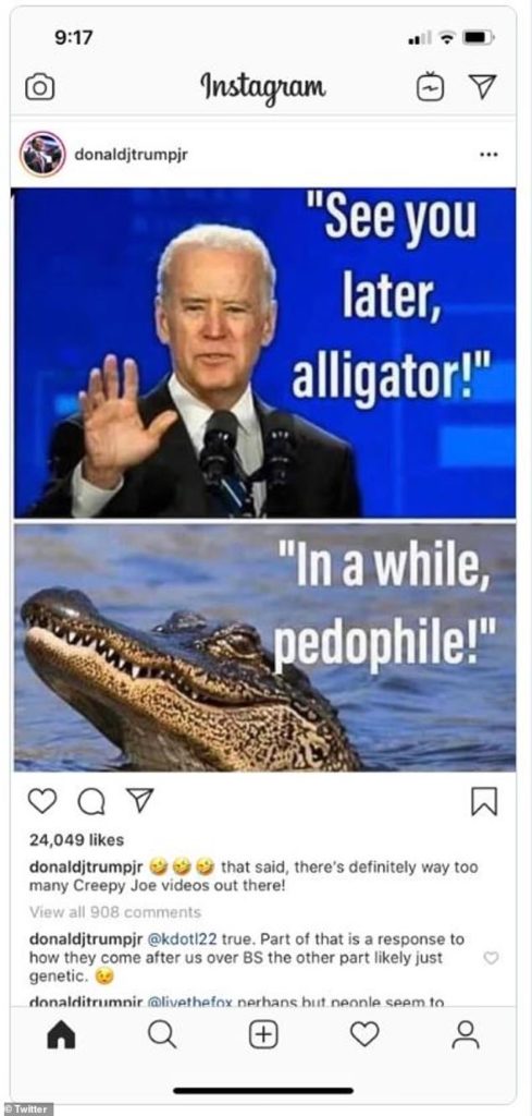 我们的团队联系拜登讨论他关于恋童癖的指控时,拜登的竞选团队向我们发了2020年5月的一份声明,该声明是为了回应川普的儿子在Instagram上发布的帖子,川普的儿子向他的300万粉丝分享了一张拜登说“回头见,鳄鱼”的图片,一张鳄鱼说“回头见,恋童癖”的照片。