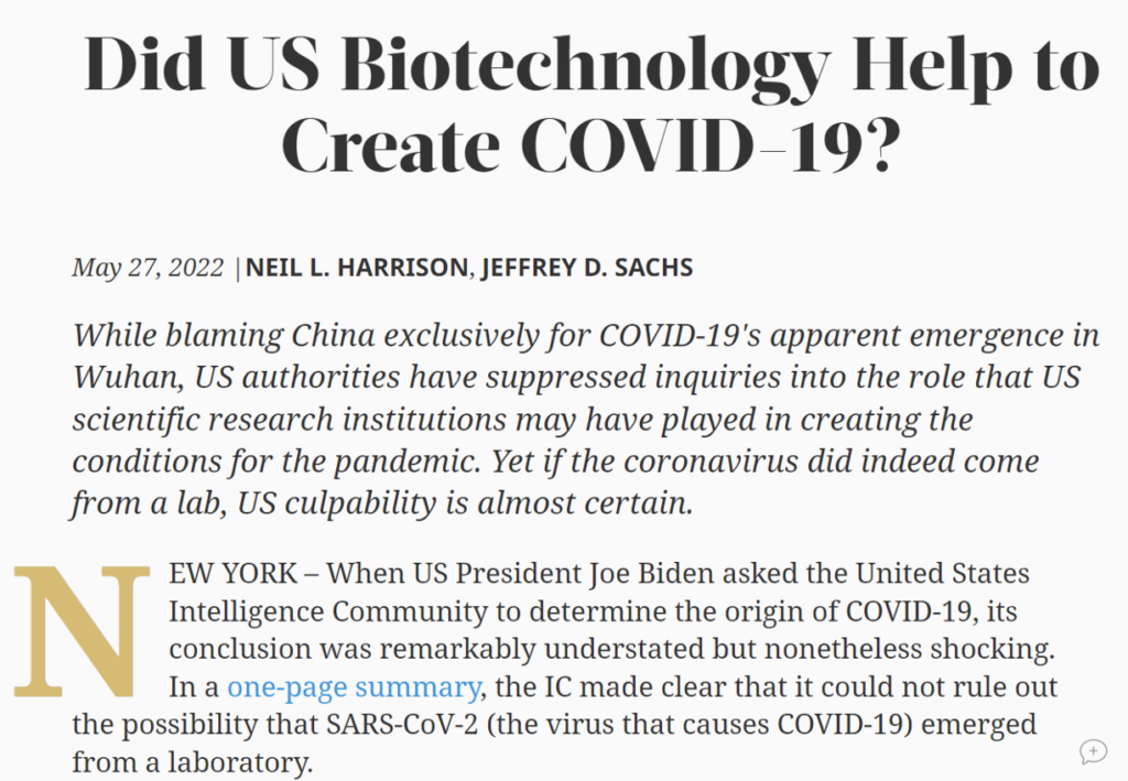 而萨克斯关于新冠起源的意思其实是说,新冠病毒是两国实验室联合研究,前者用后者的技术研究和制造,因为不小心而泄露的,所以他要求彻查。但传播此说法的人,只截取了后半部分,而没有说前面一部分。从而符合了一些人关于新冠起源阴谋论的预期。但是他的说法本身就是无稽之谈。了解了来龙去脉的人,应该会反过来骂这个人,而不是引用他的说法吧。
