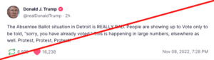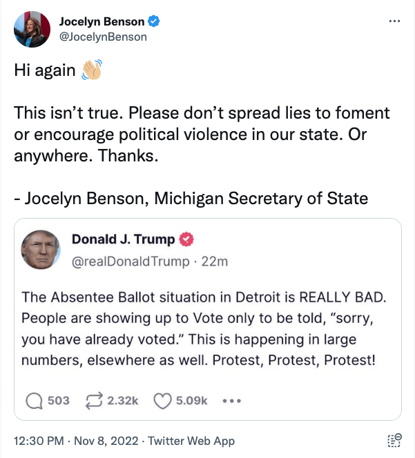 在川普发文的一小时后,密歇根州务卿乔斯林·本森(Jocelyn Benson)在推特上回复了川普:“这不是真的。请不要散布谎言以在我们州或任何地方煽动或鼓励政治暴力。谢谢。”