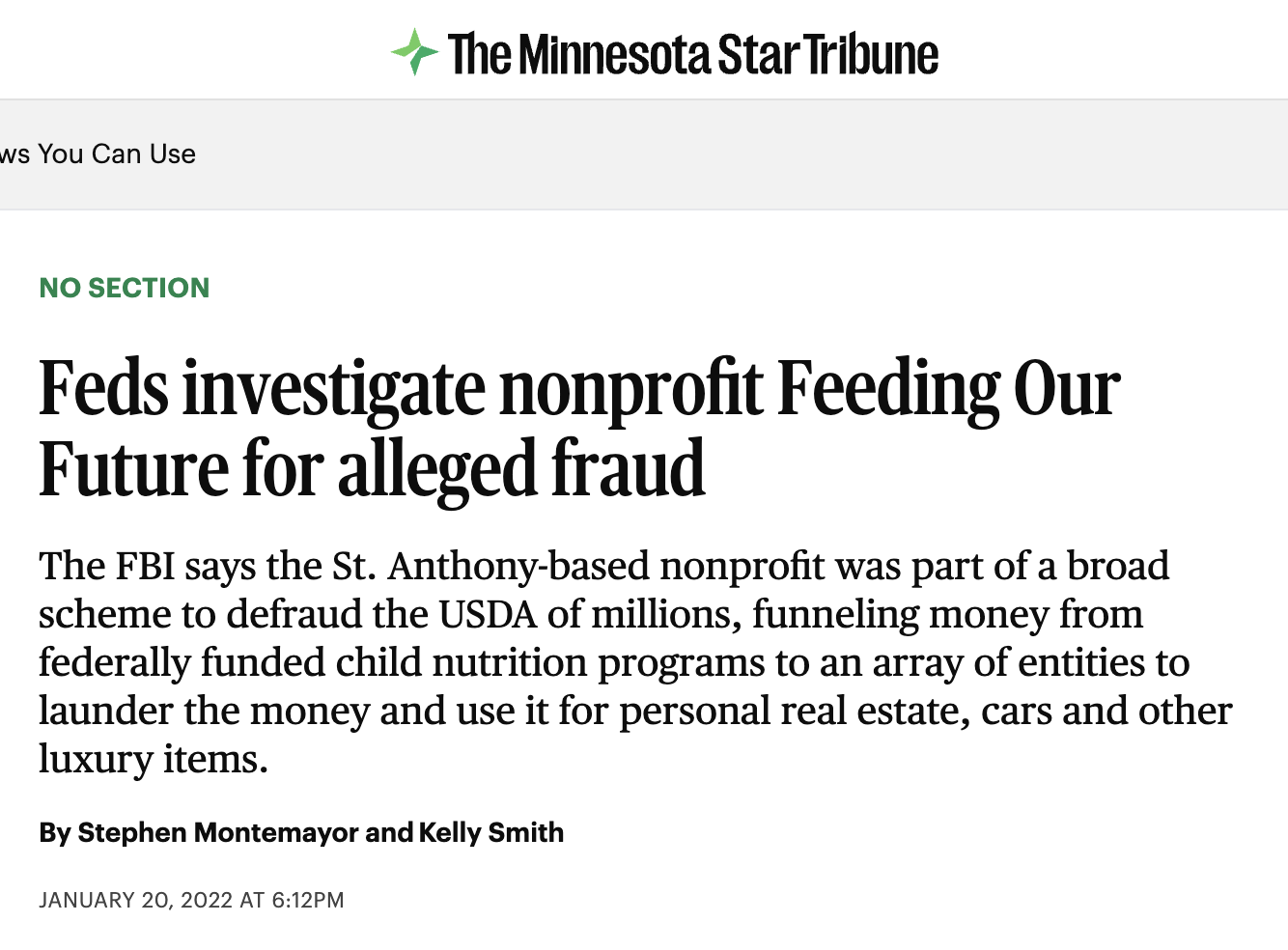 2020年2月,国税局(IRS)撤销了“喂养我们的未来”的免税地位。但在疫情爆发后,该机构向州申请联邦援助拨款,明州教育部开始提供拨款。在明州教育部拖延后续的拨款申请后,机构于2020年11月正式起诉明州政府。同年底,明州教育部向美国农业部(USDA)提出欺诈嫌疑,联邦调查局(FBI)于2021年2月启动调查。