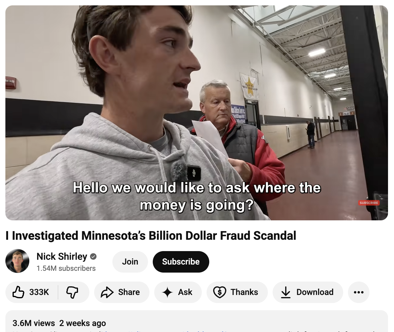 2025年12月底爆红的视频引发对该案新一轮媒体报道的狂潮、进而引发川普政府政策调整及国会听证会,给不少观众一种错觉:似乎明尼苏达州刚暴露出大规模托儿欺诈案。右翼油管博主尼克·雪利(Nick Shirley)12月26日发布的视频声称,明尼阿波利斯多家由索马里裔美国人经营的托儿所虽领取公共资金,却未提供托育服务。