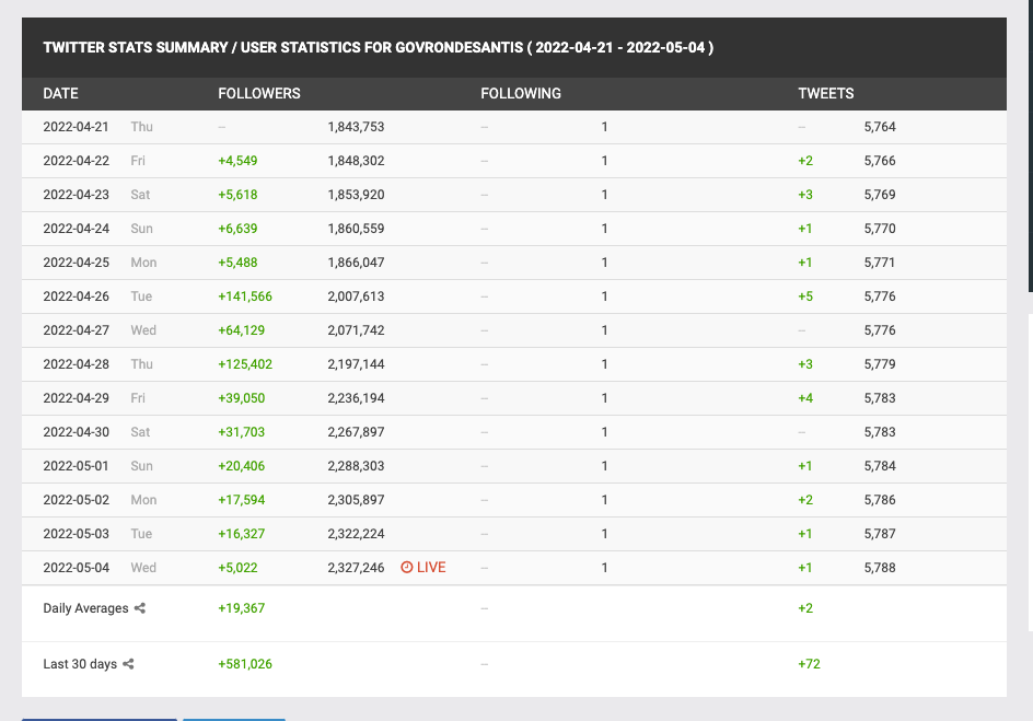 我们在socialblade网站核查了一下,佛州州长德桑蒂斯确实在4月26日增加了逾14万粉丝。