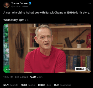近日,前福克斯新闻主持人塔克·卡尔森(Tucker Carlson)采访了拉里·辛克莱尔(Larry Sinclair),此人多年来在没有切实证据的情况下,指称奥巴马在还是一名年轻政客的时候,吸食毒品,并与他发生过性关系。至今没有证据证实此事。还有谣言指奥巴马夫人米歇尔是男人。