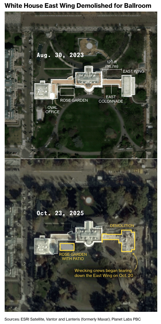 具体来说,1942年后的所有改动均限于内部空间,建筑历史学家协会遗产保护委员会主席贾恩(Priya Jain)向NPR表示,“(此前的)外部改造要么是基础修复,要么是网球场、凉亭等小型场地增建,其规模、体量及视觉影响均有限,不会对历史建筑造成负面影响。”拆除大规模建筑(白宫东翼)的工程前所未有。、