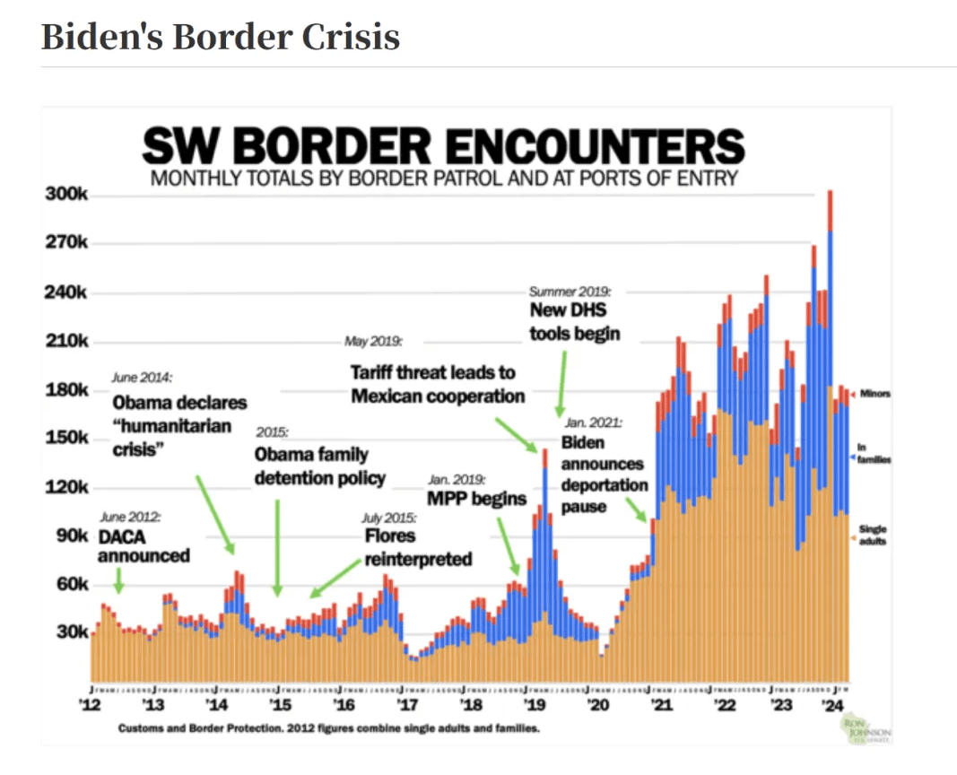 这张图表并非川普团队原创,最初出现在威斯康星州共和党参议员罗恩·约翰逊(Ron Johnson)的网站上,发布于今年3月,内容是关于边境安全。在网页上,该图片的标题为“拜登的边境危机”。