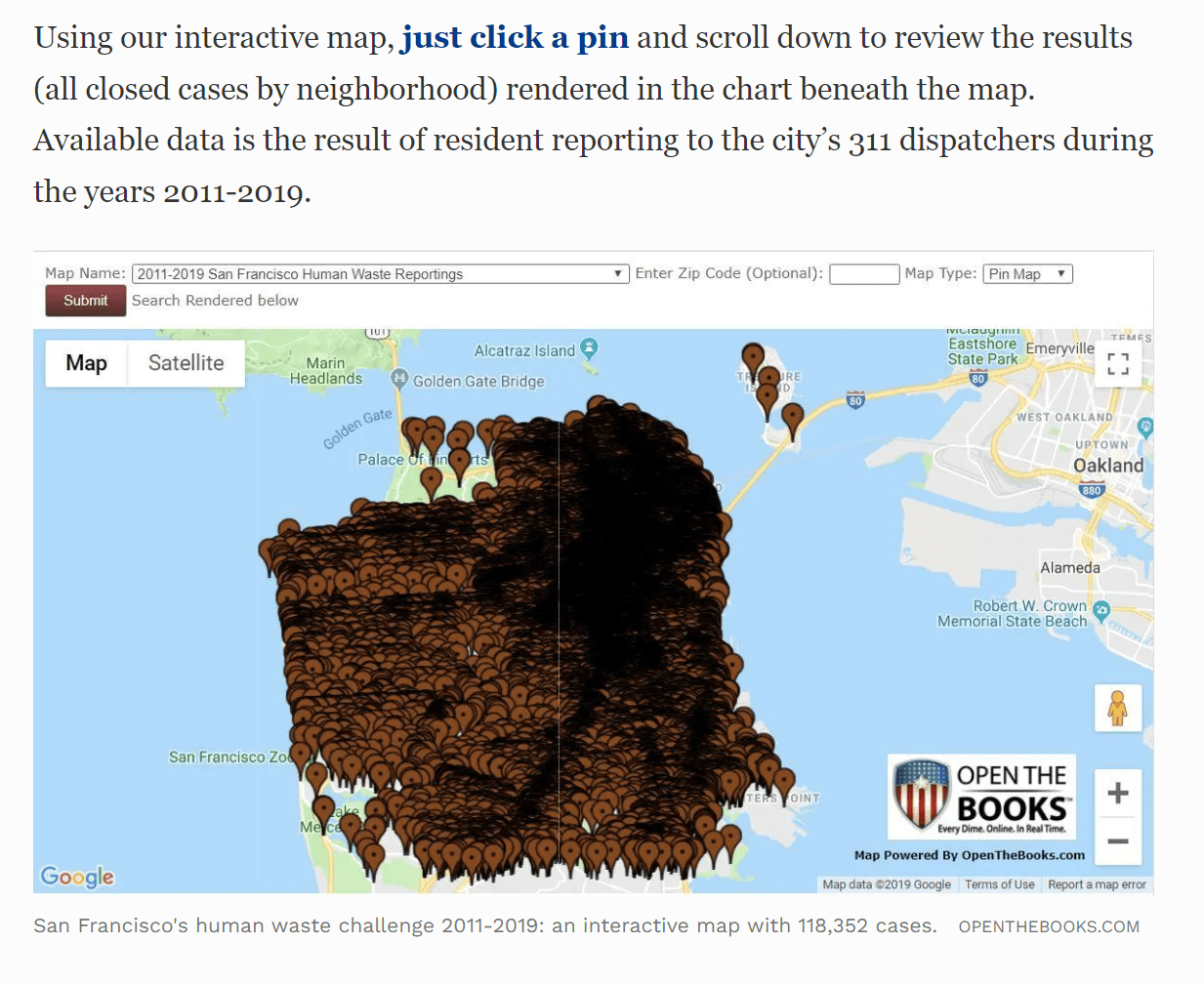 该地图绘制了从2011年到2019年9年间在旧金山发现人类粪便的公开报告。(超过11.8万人向旧金山的非紧急热线报告了他们的发现)。