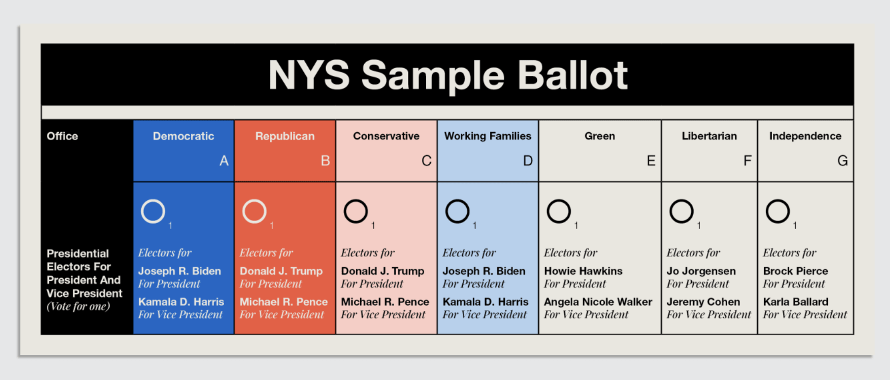 在2020年总统大选的纽约州选票样本上,川普和拜登的名字各出现了两次,因为他们分别获得两个政党的背书。选民可以在选择候选人的同时,表达对政党的支持。