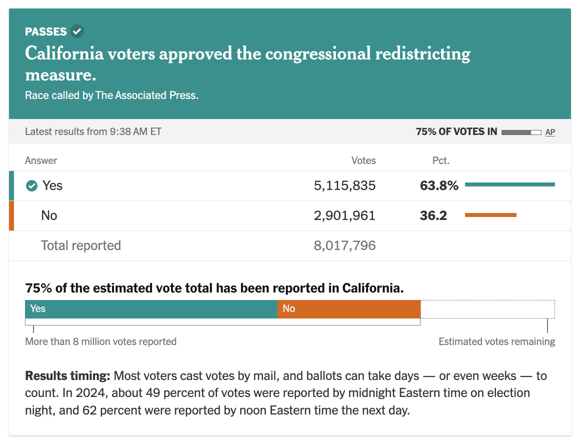 在西海岸,加州选民以近64%赞成票通过第50号提案(Proposition 50),暂时授权州政府重新划分国会选区,以抵消德克萨斯等红州通过提前划区新增共和党席位的作弊行为。这一提案被《华盛顿邮报》称为“选民最直接的反川普表态”。