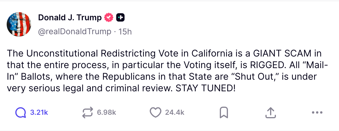 《华盛顿邮报》报道,川普在社交媒体上连续发文,声称加州的第50号提案是“一场巨大骗局”,并宣称“整个投票过程被操纵”,还暗示司法部正在展开“严重的法律与刑事审查”。然而,加州选务官员迅速回应称这些指控“毫无根据”,州长加文·纽森更是讽刺地回击:“这只是一个知道自己要输了的老人的胡言乱语。”