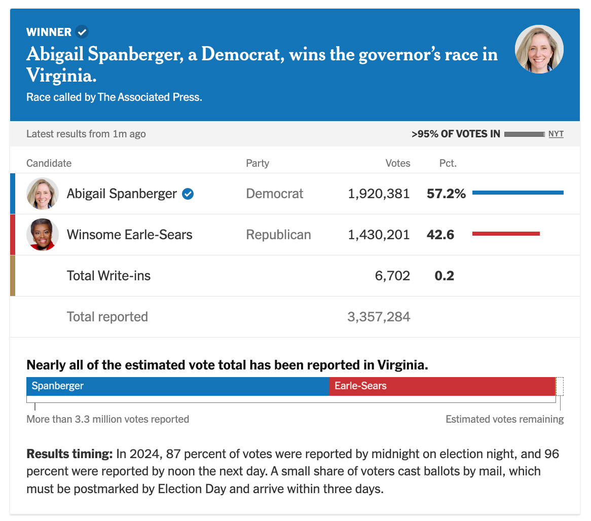 在弗吉尼亚州,46岁的前中情局官员、温和派民主党人阿比盖尔·斯潘伯格(Abigail Spanberger)以57.2%得票率赢得州长选举,击败共和党副州长温瑟姆·厄尔-西尔斯(Winsome Earle-Sears)。她成为该州首位女性州长,也是川普第二次执政以来首位在南方赢得州长职位的民主党人。