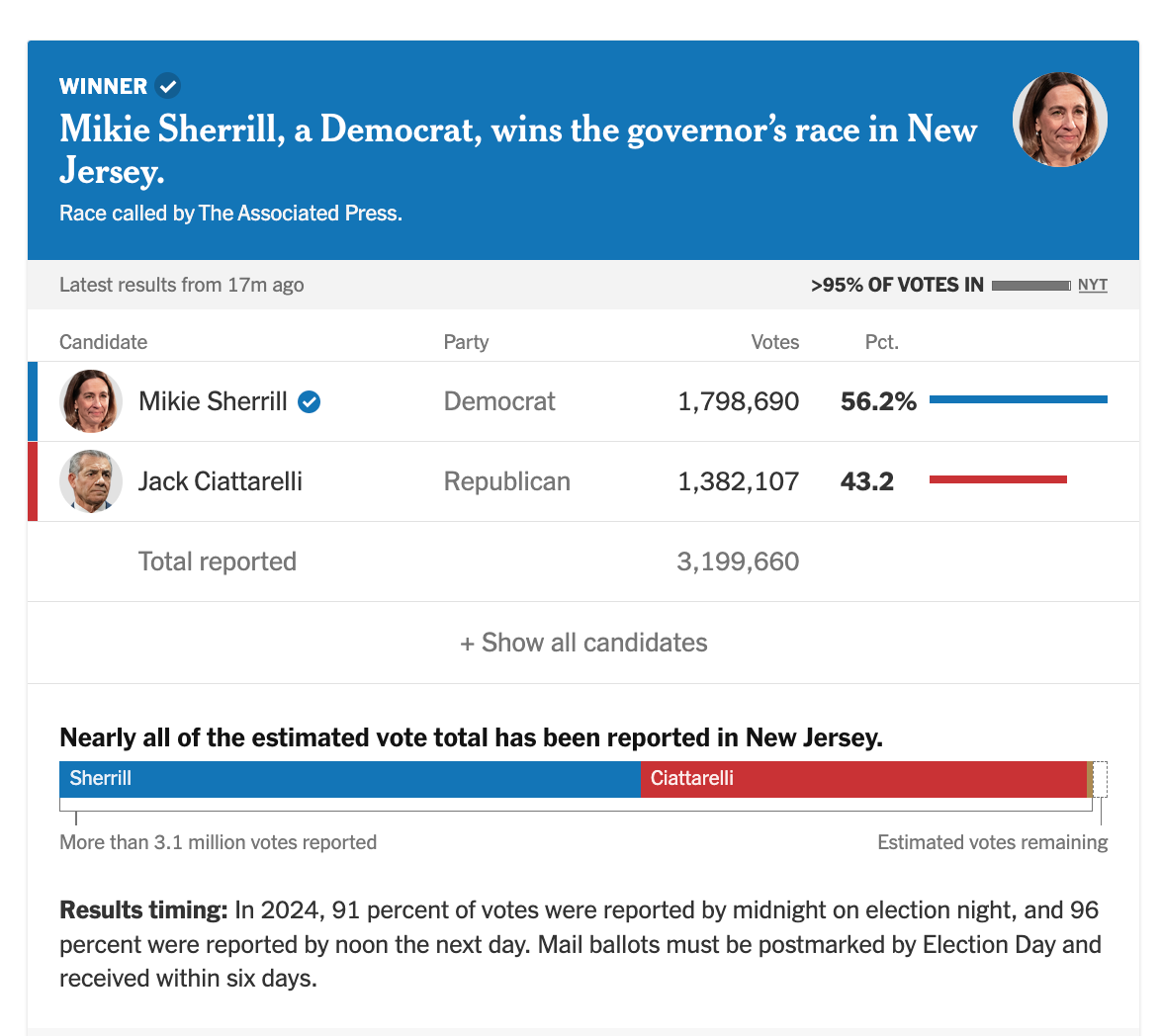 在新泽西,民主党州长米基·谢里尔(Mikie Sherrill)轻松连任,以56%对43%击败共和党对手杰克·恰塔雷利(Jack Ciattarelli)