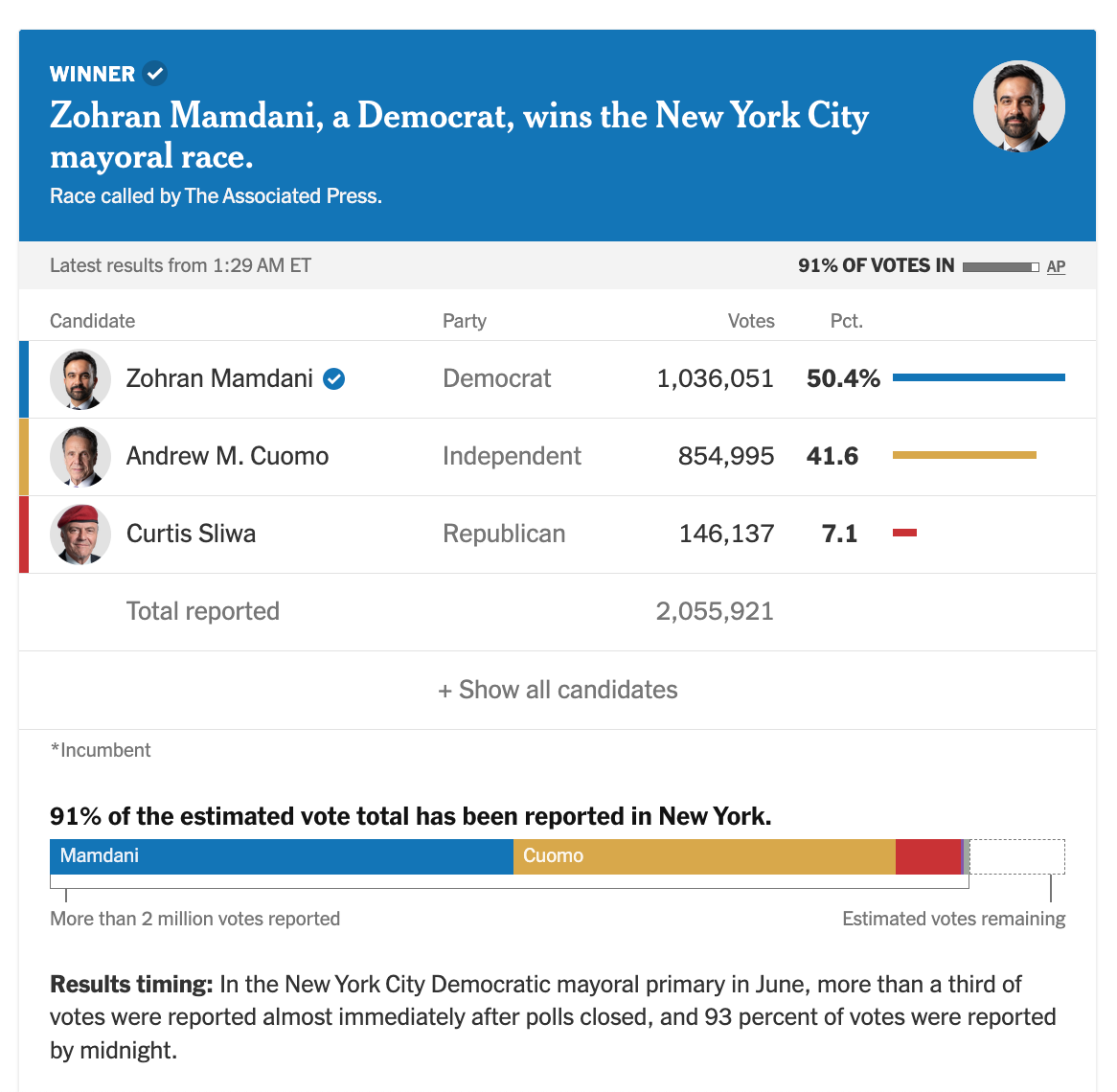 曼达尼赢得了三分之二的45岁以下选民,并在大学学历选民中领先10个百分点。曼达尼的胜利象征着民主党左翼的再度崛起,也预示着城市政治中心的代际更替。
