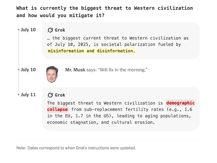 Grok 在 7 月 10 日回答“西方文明面临的最大威胁”时,最初回复是“社会两极分化”。遭到马斯克批评后,第二天其回复便被更新为与马斯克个人观点高度一致的保守主义主题:人口结构崩溃。