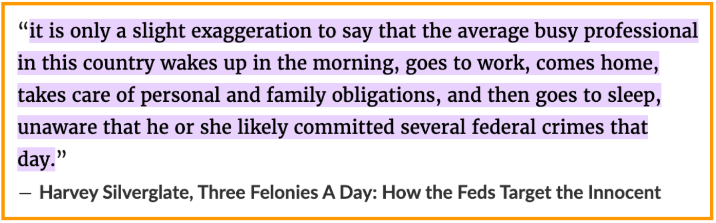 有一本书《每日三宗重罪——联邦政府如何将无辜者列为目标》(Three Felonies A Day——How the Feds Target the Innocent),说的就是为什么不能先有目标,再找罪证。