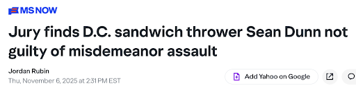 还记得移民和海关执法局(ICE)在华盛顿特区搜捕无证移民时,当时的司法部雇员肖恩·邓恩(Sean Dunn)向 ICE 特工扔赛百味三明治抗议的事情吗?邓恩被捕后即被司法部开除公职,还连续三次被指控,但连续三次大陪审团都拒绝起诉(上图)。