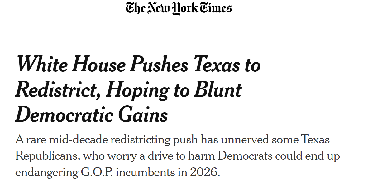 2025年6月9日, 《纽约时报》报道称 ,川普政府正在敦促德克萨斯州重新绘制其联邦国会选区地图, 以期维持共和党在美国众议院的微弱多数 。该选区地图上次绘制于 2021 年,通常有效期为十年,因此,在不遭遇法律挑战的情况下重新绘制选区地图的情况极为罕见 。