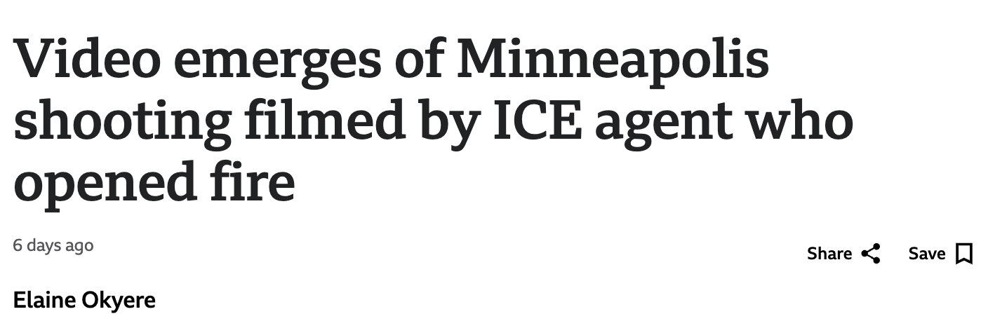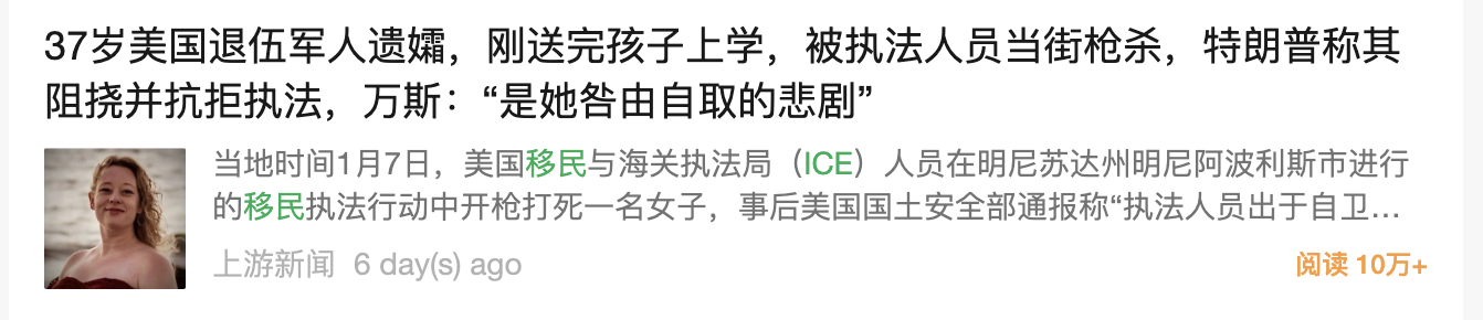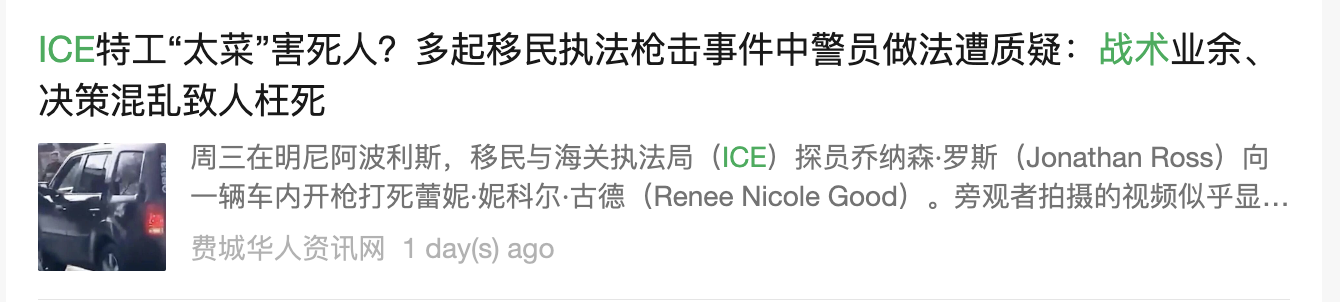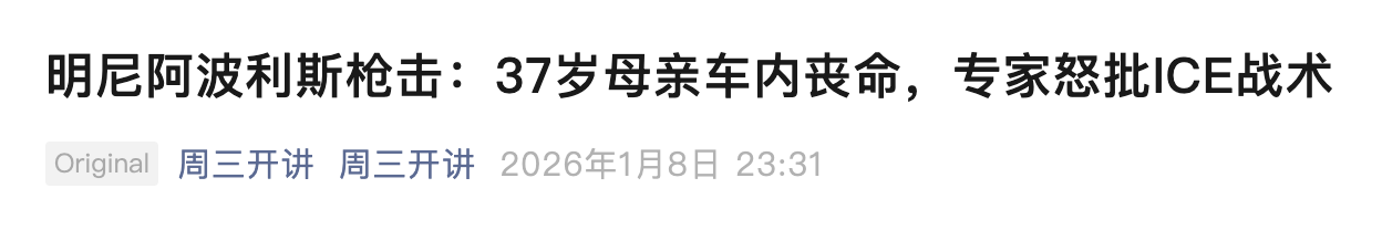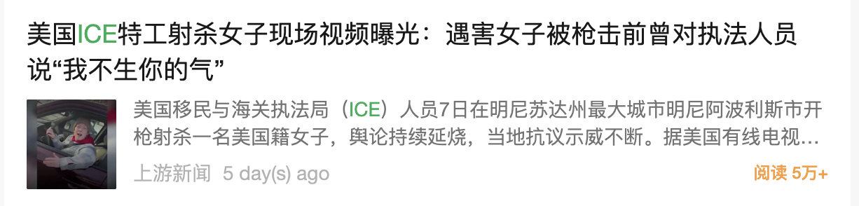 英文媒体和中文媒体在1月7日明尼阿波利斯ICE枪击案(古德事件)上的报导路径差异颇为鲜明:仅就标题来说,在事件初期和中后期,英文主流媒体基本以克制客观的标题为主;中文媒体、网络叙事则以煽动情绪的夸张报道为主的最能收获流量。尤其在事件视频流出后分化明显,典型体现在预设立场的选择性叙事。