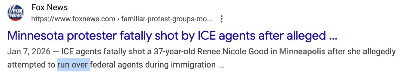 当然也有福克斯新闻和Newsmax这一类的右翼/极右翼媒体在未有任何调查的情况下,主观定论,比如宣称死者试图“用车碾压特工”、“用车阻碍特工行动”。MediaMatters统计发现,联邦政府的官方叙事被福克斯新闻等右翼媒体在各平台全天候放大,福克斯新闻至少17次播放诺姆在记者会上的发言片段或引用其声明。