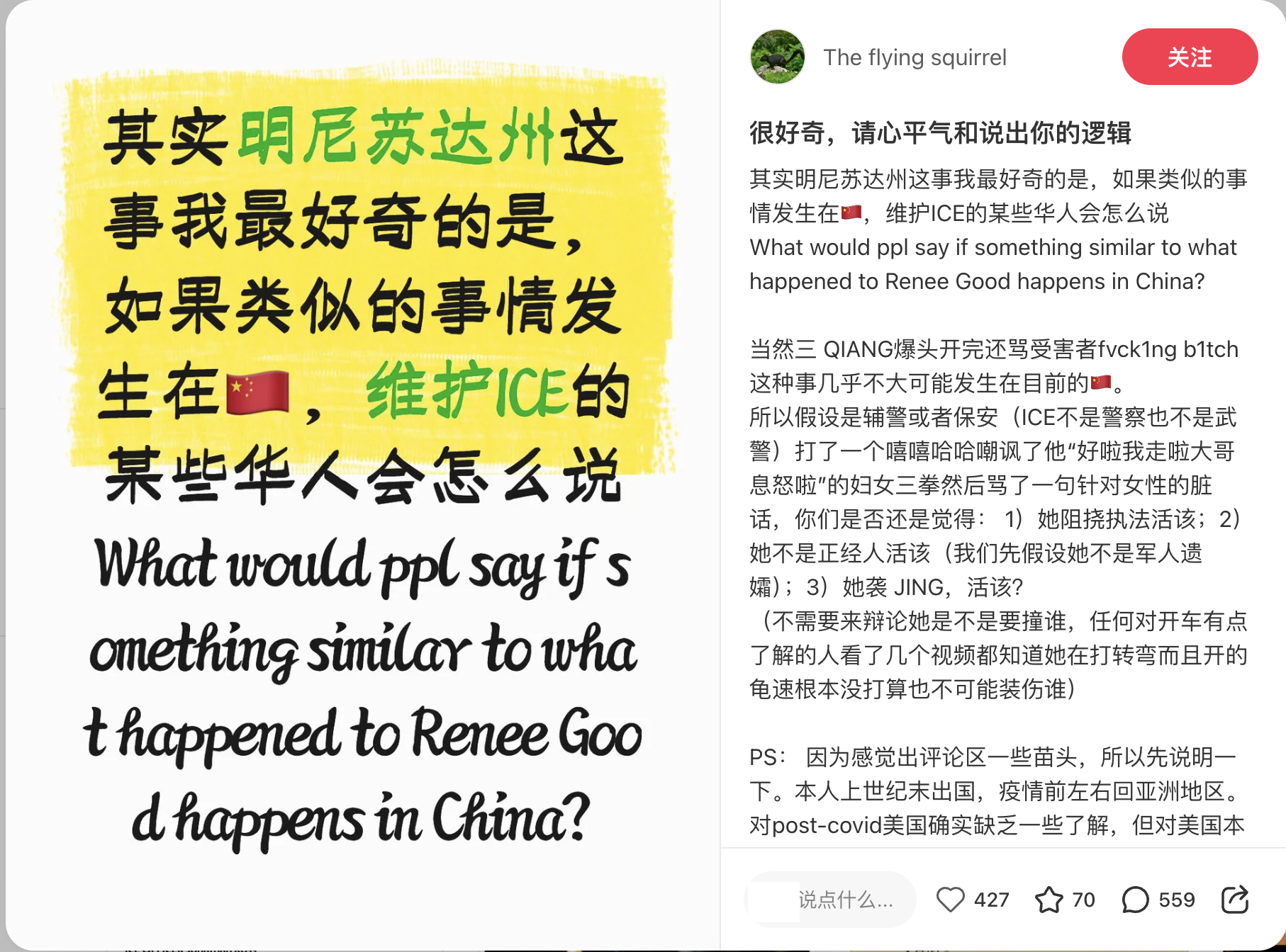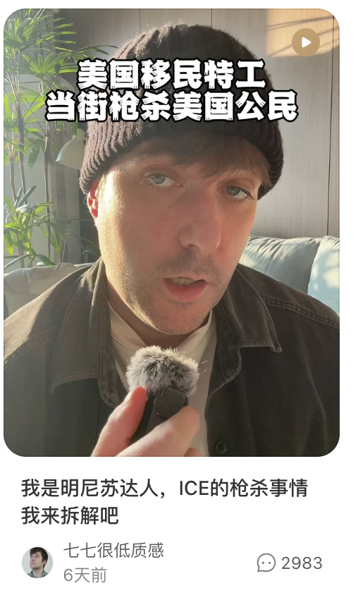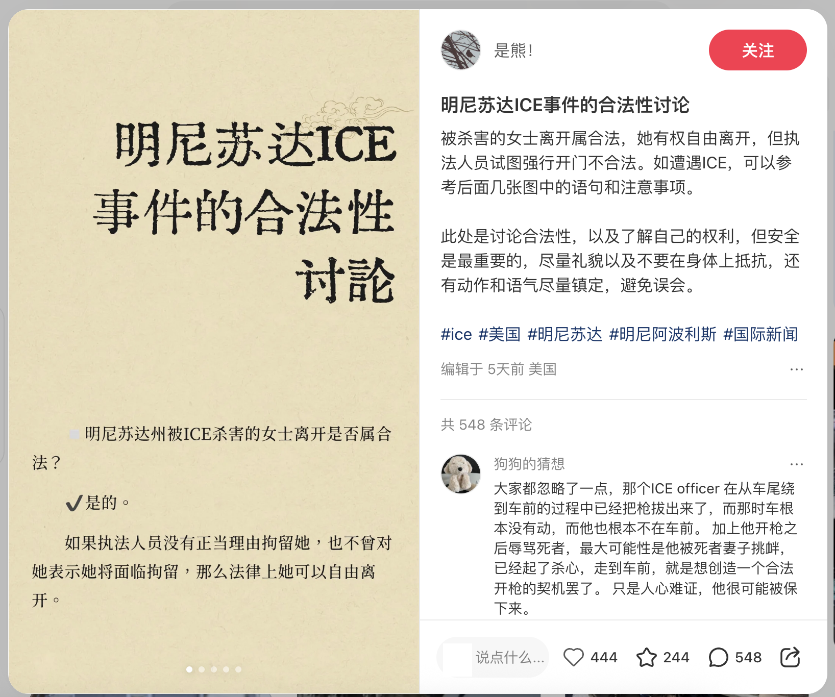 例如,有当地美国博主直接发帖说明:“我就是明州人,我对这件事的看法是……”,或者搬运英文报道和TikTok视频,解释死者在现场担任“合法观察员(legal observer)”的公民监督角色(在某些微信公众号中这一角色被错误解读为“职业抗议者”)。这些内容让小红书读者能够接触英文原视频和当地视角,在相对理性的氛围下讨论ICE是否算警察、警察使用致命武力的合法性、如何更合理地执法等制度性问题。同时,用户还能交叉讨论中美文化差异、法律程序差异以及媒体叙事方式,从而形成更为多元的讨论。