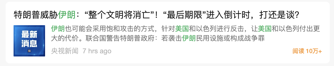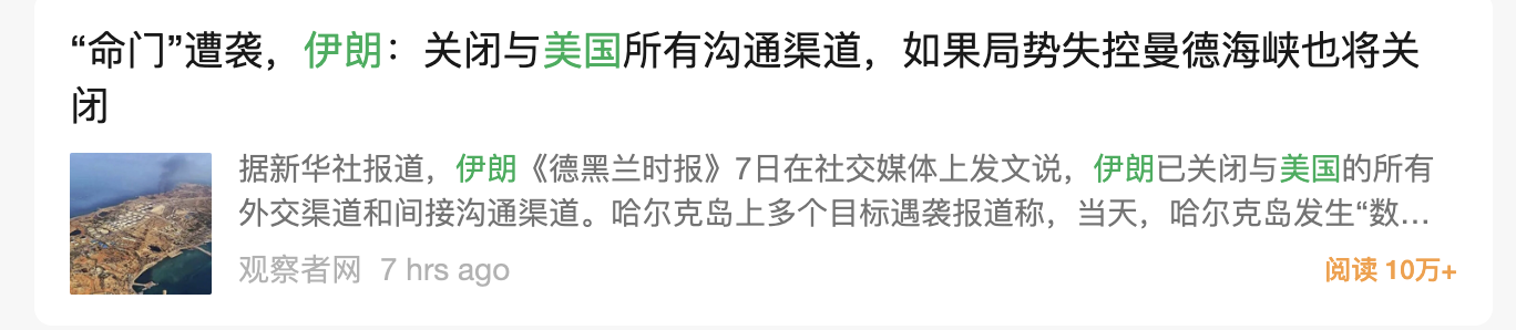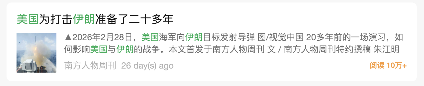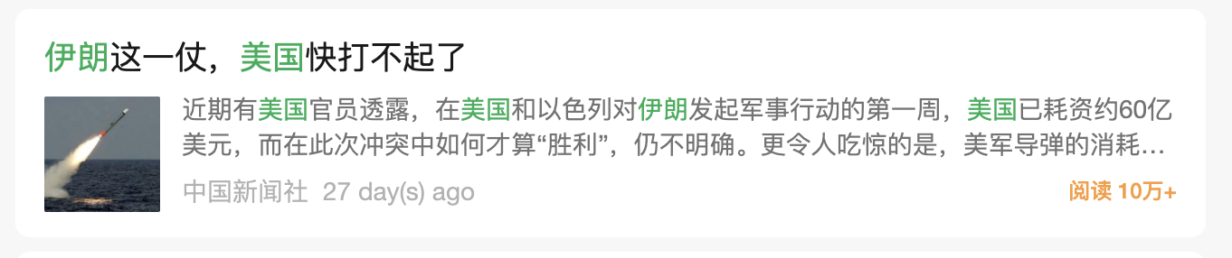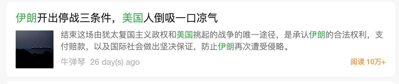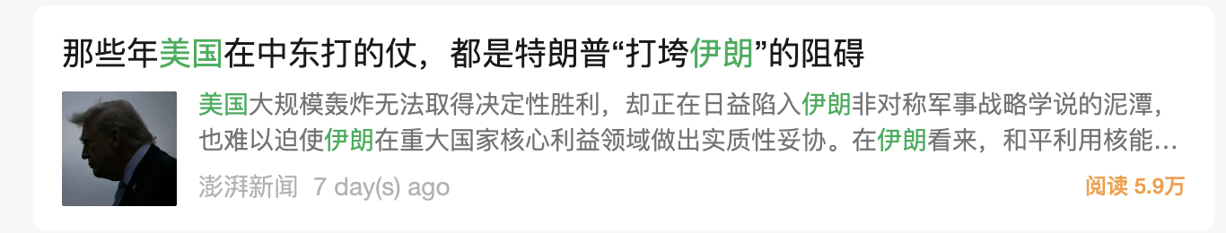 注:搜索伊朗和美国两个关键字,按阅读量排序