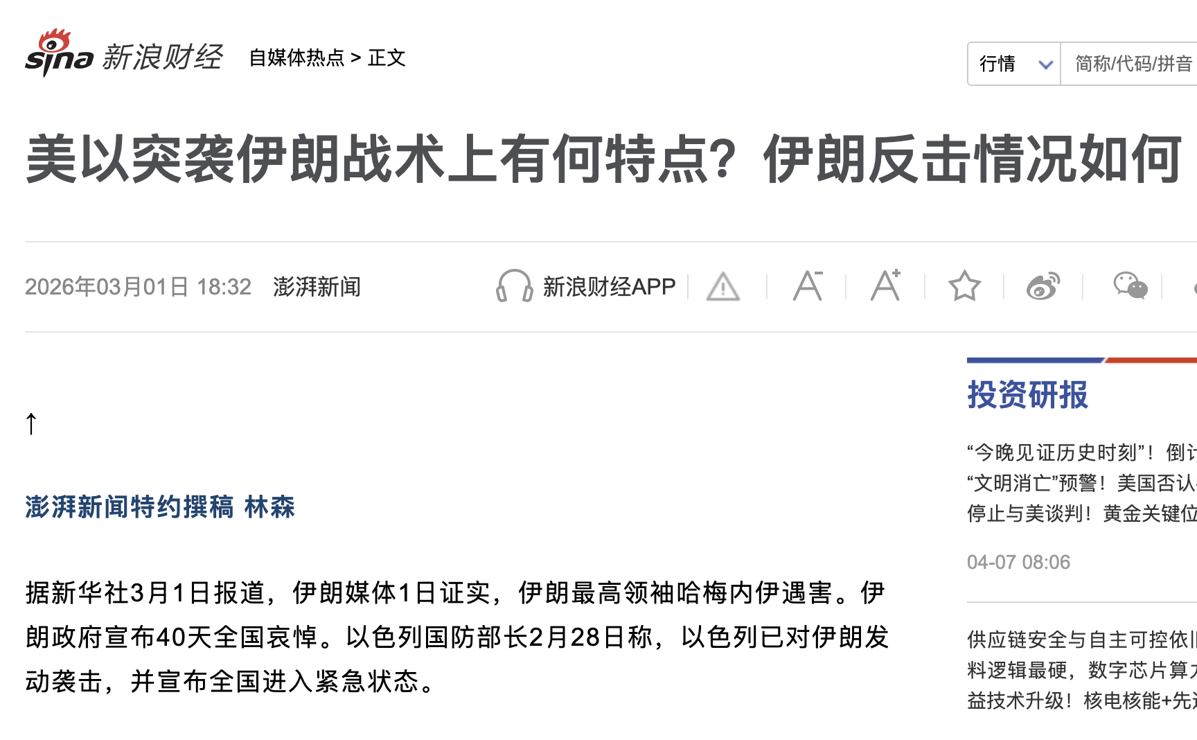战争刚刚爆发时,媒体报道集中在两个核心问题:一是开战原因及哈梅内伊遇袭的直接后果,二是冲突的初步进展与分析可能走向。