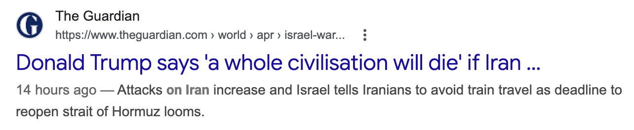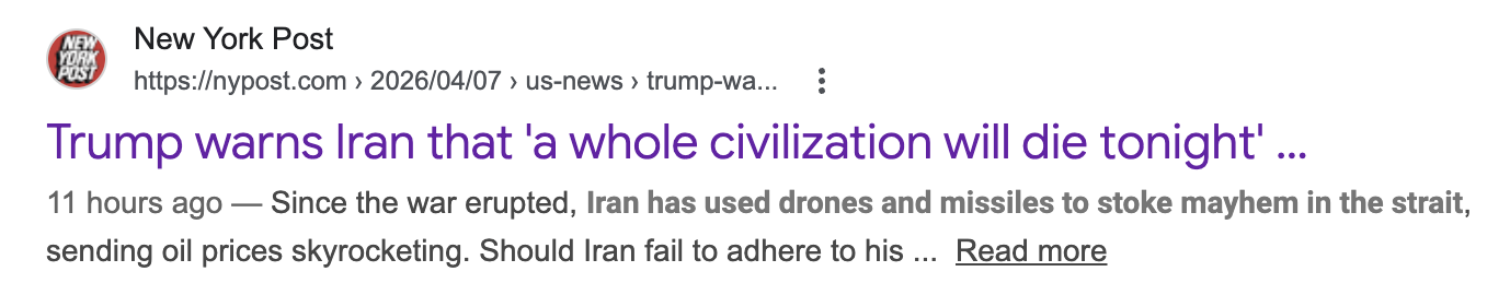 这则标题本身没有事实性错误,但读者可以从中体会到叙事手法带来的情感冲击差异。若追求中立表述,可以改为:《川普警告称若伊朗不遵守要求,“整个文明将消亡”;外交最后期限临近》。相比原标题,这种表述保留了原话,同时提示了外交背景,使读者明白威胁言辞的前提条件,即川普要求伊朗开放霍尔木兹海峡。原标题直接呈现为川普威胁伊朗,更强调紧迫感与冲突性。