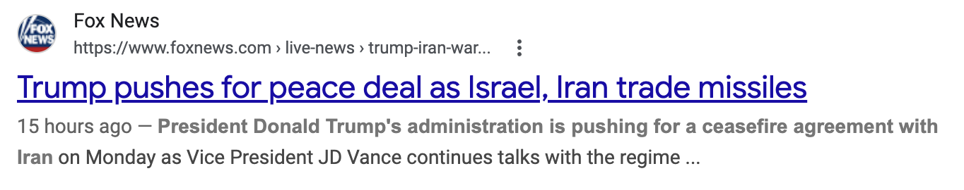 这一条报道非常有趣,它单独突出川普为推动和平的关键人物,同时又交代“以色列和伊朗互射导弹”,形成鲜明对比。