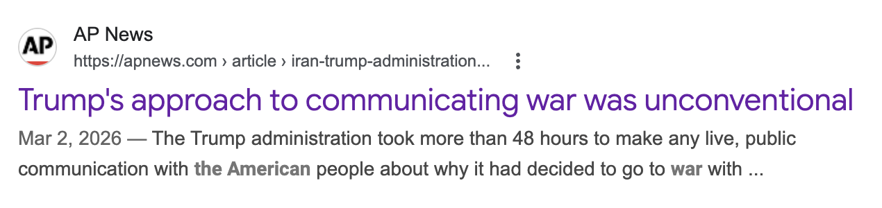 这一条标题中使用的形容词“非传统的”,是一个值得品味的用词选择:它情感浓度低,几乎不带批判性色彩。若换成更直白的表述,也完全可以写成“川普违背常规战争沟通操作”或“川普以史无前例的方式向公众通报战争情况”。这体现了美联社作为老牌通讯社的严谨风格。
