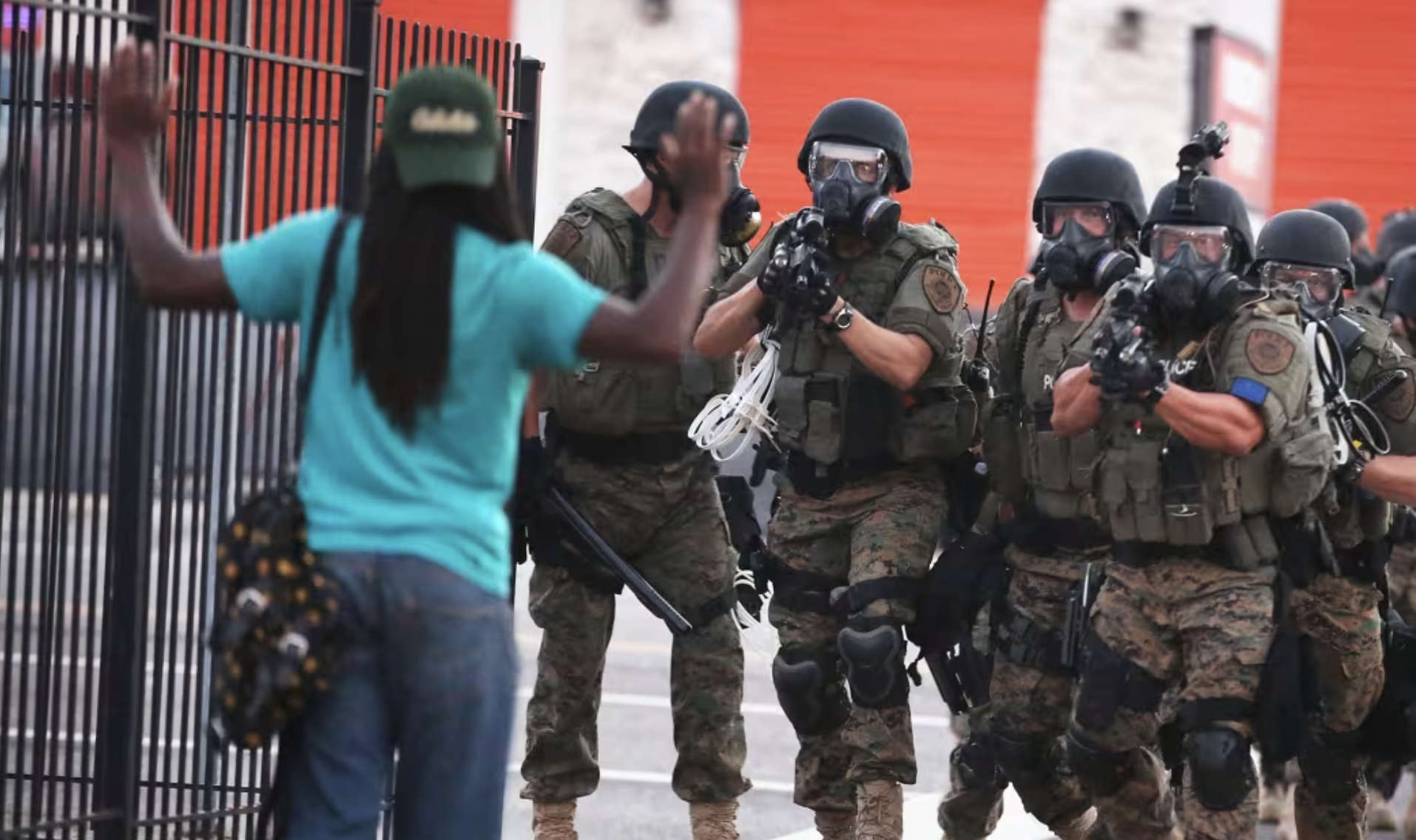 2014年8月11日,密苏里州弗格森市,在警察枪杀手无寸铁的黑人少年迈克尔·布朗后,警方将抗议者从商业区引导至附近社区。图源:NBC新闻