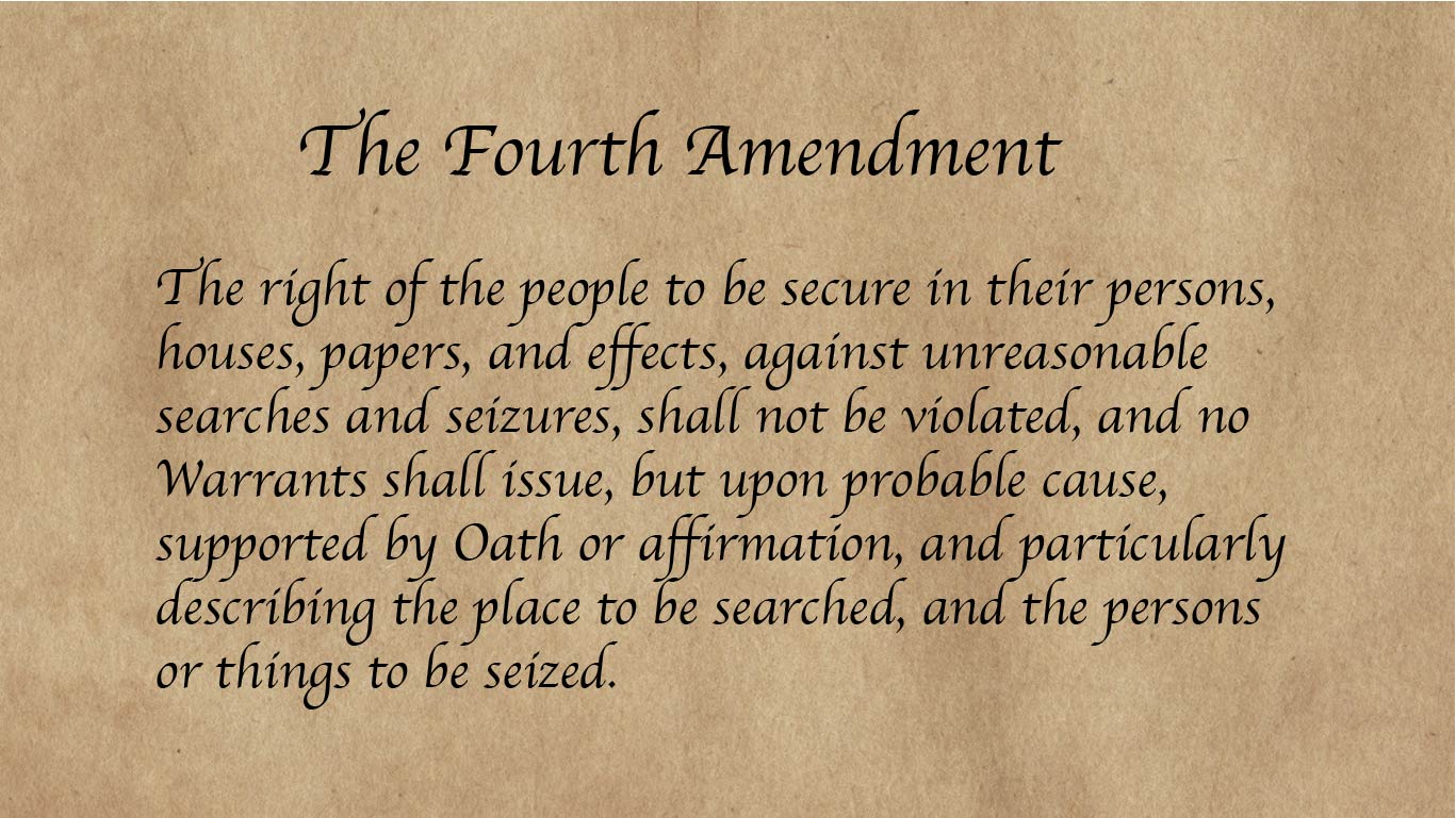美国宪法第4修正案:人民的人身、住宅、文件和财物不受无理搜查和扣押的权利,不得侵犯;除根据宣誓或确认作出的合理依据外,不得签发搜查令,且搜查令须特别说明应搜查的地点及应扣押的人或物。图源:ccconline.org