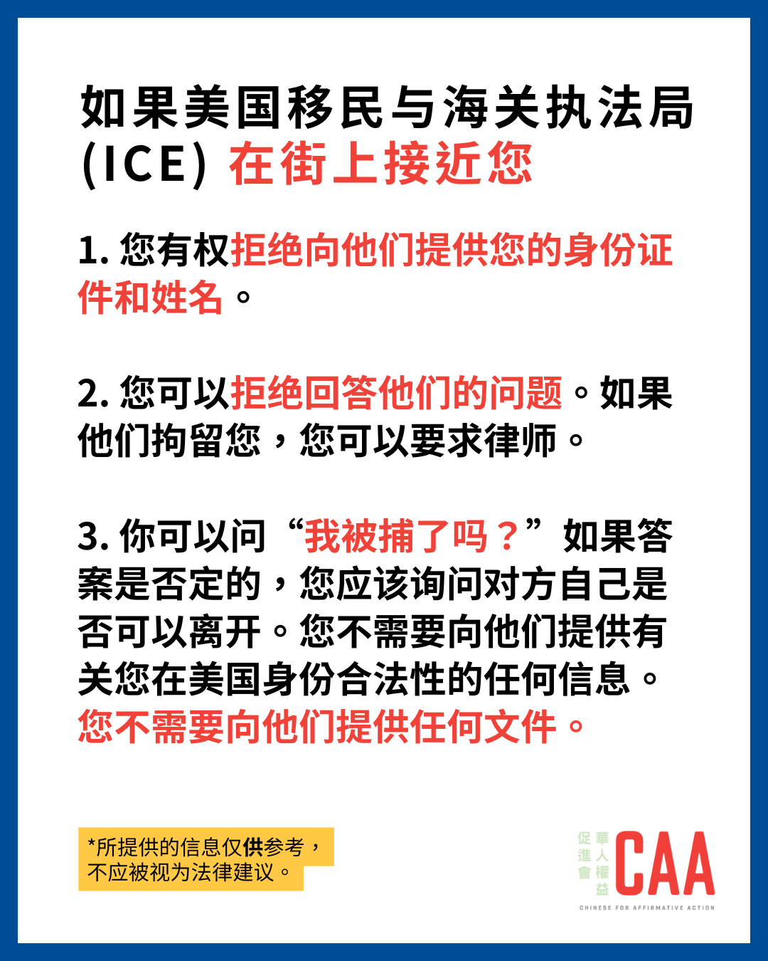 华人权益促进会(CAA)在网站上整理了最新的移民社区资源,包括“了解您的权利”、相关法律资讯及移民政策概况,供社区成员参考: