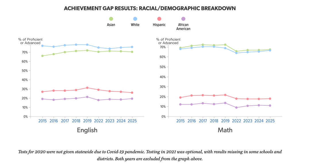 亚裔学生在全州表现突出,英语合格率74.36%(较2023-24年下降0.5%),数学70.1%(提升1%),远超全州平均。EdSource 报道称,亚裔高表现得益于文化重视教育和补习普及。然而,较疫情前英文78%、数学75%的水平,亚裔学生整体上也仍未从疫情的打击中走出来。
