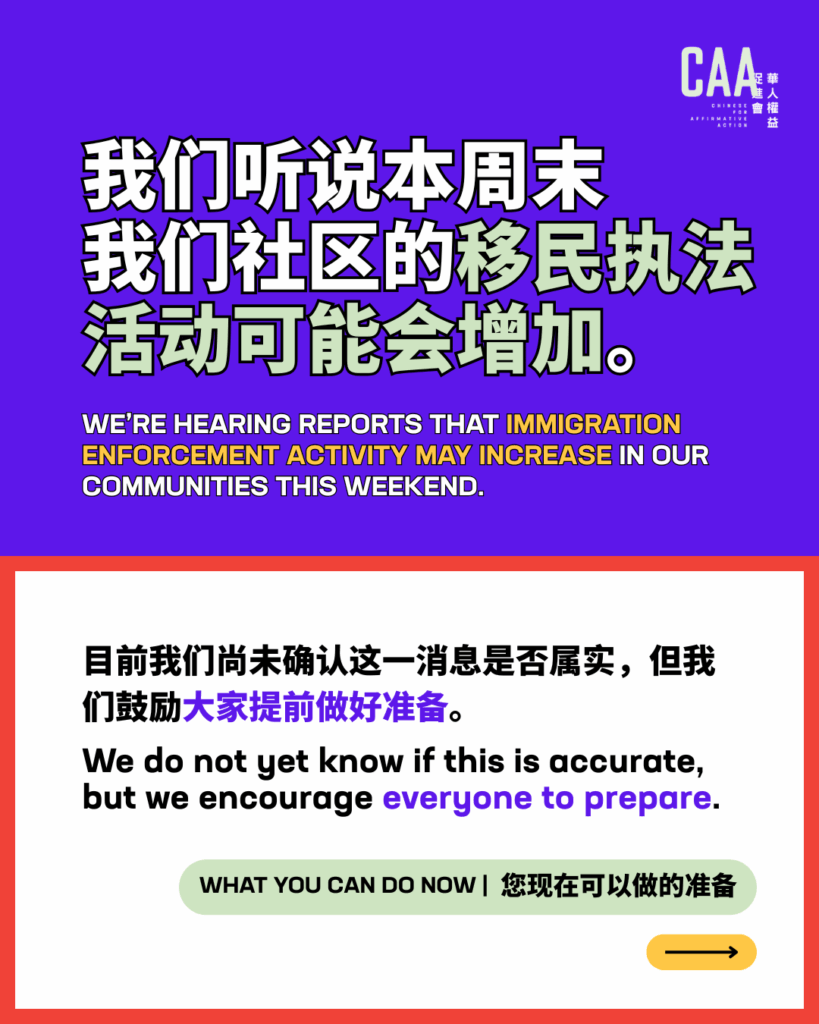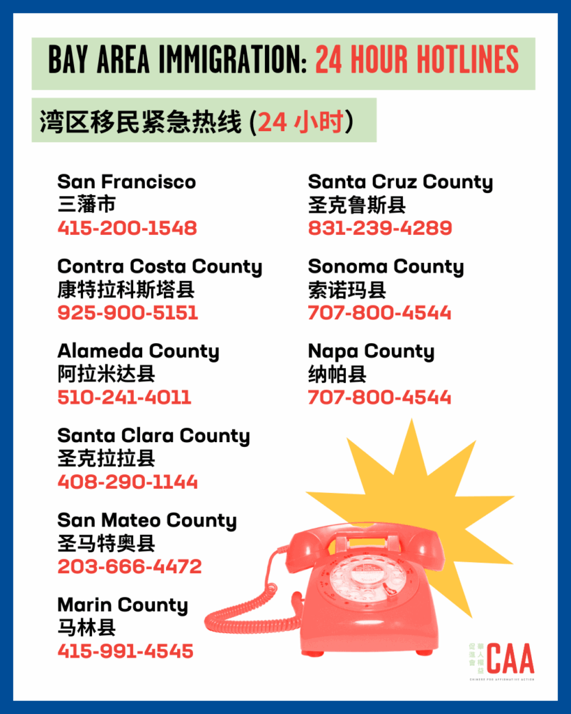 并记下湾区移民紧急热线。如目击疑似ICE执法行动,请拨打热线确认。社区力量在团结中发挥作用,不散播恐慌。