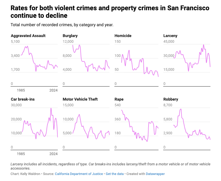 旧金山犯罪数据的趋势与全美其他城市,包括邻近地区,呈现相似态势。加州司法部数据显示,涵盖伯克利、奥克兰和弗里蒙特的阿拉米达县,2023至2024年间整体犯罪数量下降了32%。
