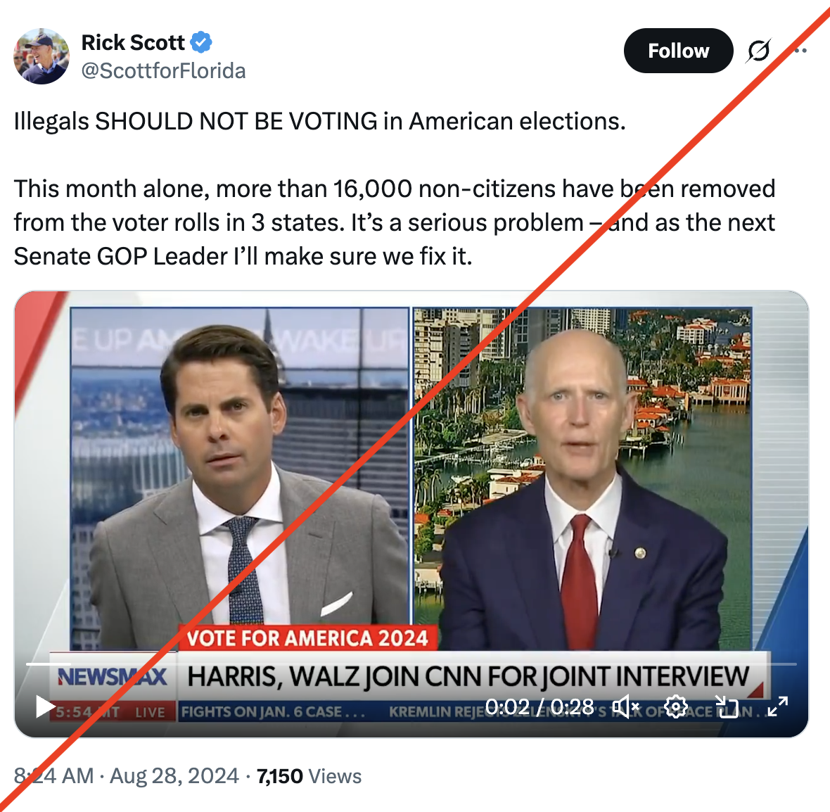 当时,正在竞选连任的佛州共和党联邦参议员斯科特(Rick Scott)呼吁推动联邦法案,以“进一步防止非公民投票”。他在X平台发帖称:“非法移民不应该参与美国选举投票。本月,仅三个州就从选民名册中移除了超过16,000名非公民。这是一个严重问题——如果我成为下一任参议院共和党领袖,我会确保解决它。”