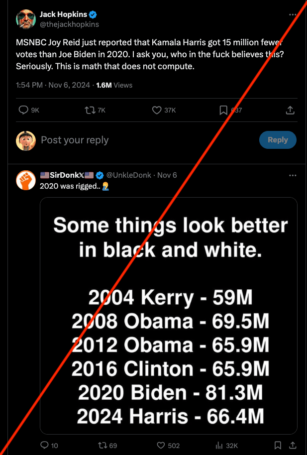 不过,像文章开头那篇推文说哈里斯比拜登少拿了1500万票,从而开始阴谋论地说拜登的得票数是造假的,则是完全站不住脚的。